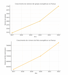 A França, historicamente identificada como católica e hoje marcada pela secularização, assiste a um avivamento evangélico que começa a remodelar sua paisagem espiritual. Nos últimos cinco anos, o número de igrejas evangélicas cresceu de forma consistente, atraindo fiéis de diferentes origens e ocupando parte do espaço deixado pelo declínio do catolicismo. Dados do Conselho Nacional de Cristãos Evangélicos da França (CNEF) indicam que, entre 2017 e 2022, o país passou de 2.521 para cerca de 2.700 locais de culto evangélico — um aumento de 7,1 %. Hoje, são aproximadamente 750 mil praticantes regulares, o que representa cerca de 1,1 % da população francesa.